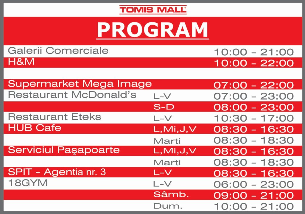 Program zilnic Galerii Comerciale: 10:00 – 21:00